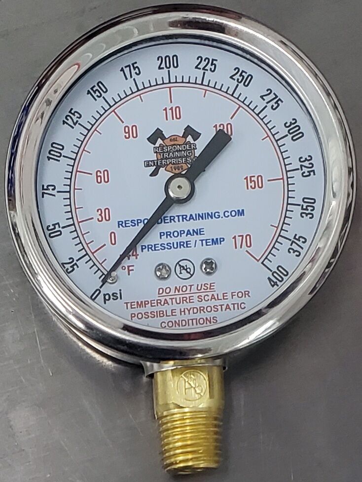 400 psi PROPANE bottom mount pressure gauge with 1/4″ male NPT threads with correlating product temperature scale.