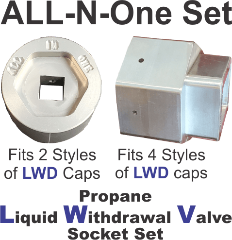 The Propane-ALL-N-ONE-socket set has been designed to be used on 6 of the most common liquid withdrawal valve caps in use today.